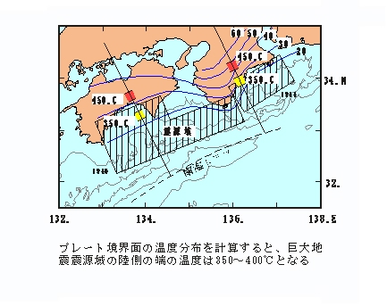 これらの観測で得られたデータを基に地下の温度構造モデルを構築する研究を行っています。この研究テーマの一つがプレート沈み込み域の地震発生帯の温度構造の推定です。この地震発生帯は流体の移動や物質収支などの観点からも注目を集めている場所であり,その温度構造は,震源域の拡がりと密接に関係するだけでなく,ここで起こるさまざまな現象の環境条件としても重要です。1999年以降,特に四国沖南海トラフにおいて重点的に観測を実施しました。この海域は1946年に発生した南海地震の震源域を含んでいます。ここで得られた詳しい熱流量分布を基に新しい温度構造モデルの構築を目指しています。
