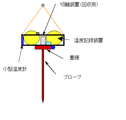 C観測を終えると温度プローブと重錘を切離し,本体の記録部分を自己浮上させ,回収します